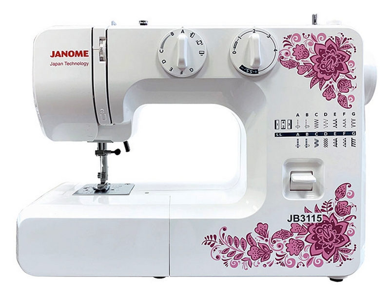 Компактная недорогая электромеханическая швейная машинка, выполненапо стандартной классической технологии, дизайнсоответствует только данной модели. Небольшое достаточное количество строчек и операций определяет назначение модели JB3115 для  начинающих любителей шить. Довольно мощная игольная пластина в машинах Janome  позволяет эксперементировать с типами тканей не боясь поломки .